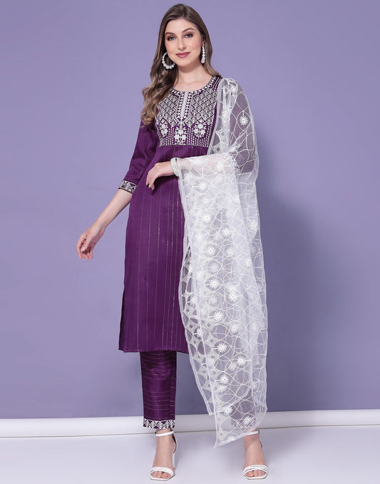 Wine Cotton Embroidery Straight Kurta Set With Dupatta