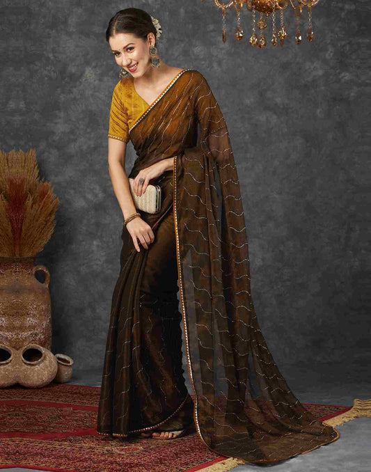 Wood Brown Chiffon Plain Printed Saree