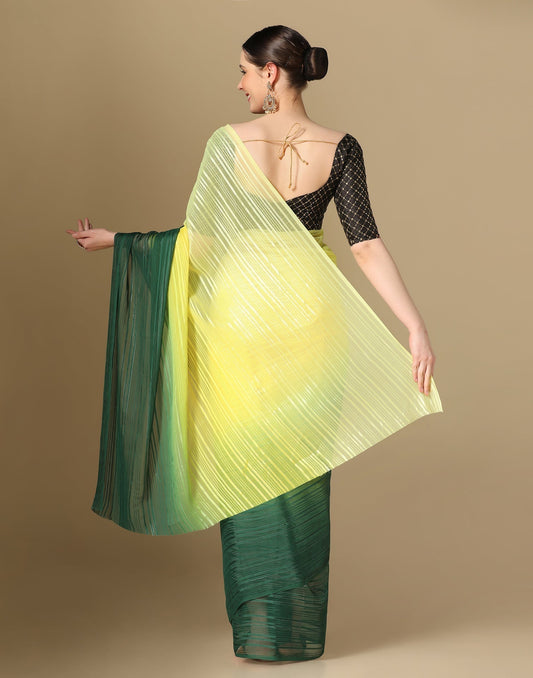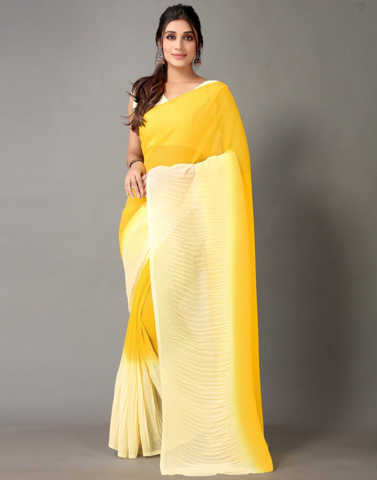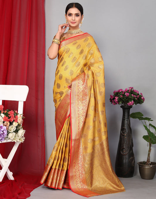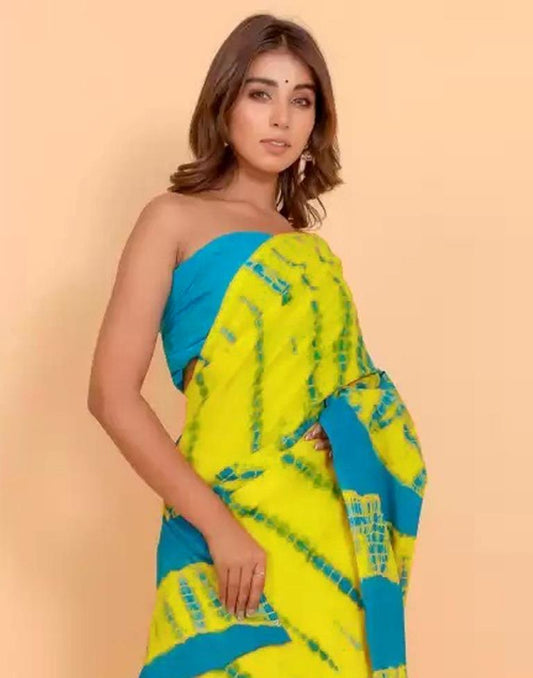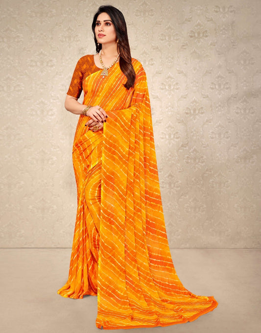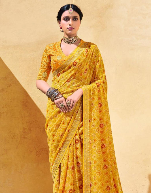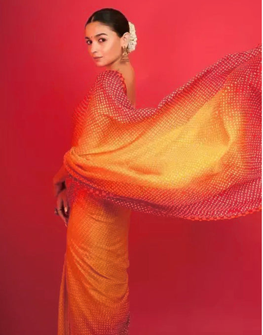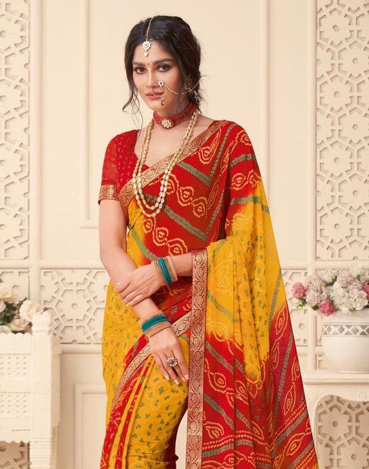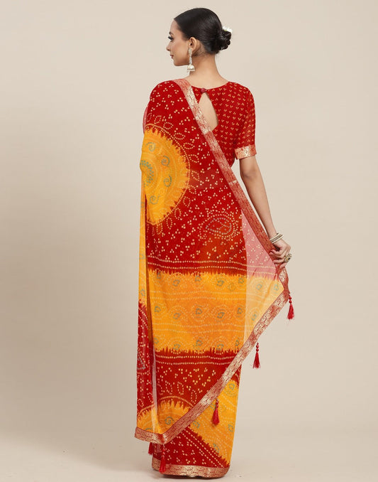 Yellow And Red Satin Silk Bandhani Printed Saree