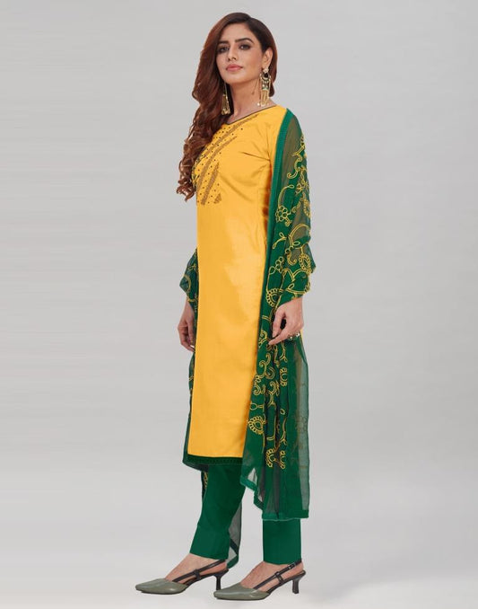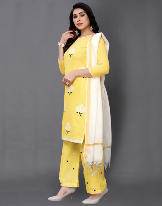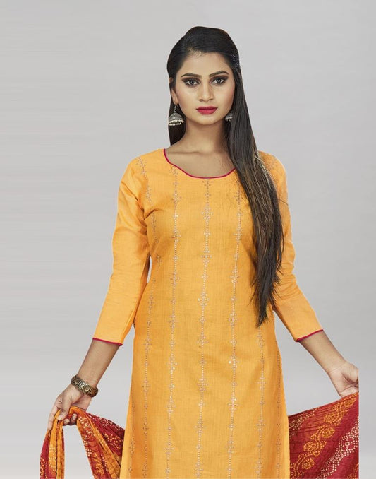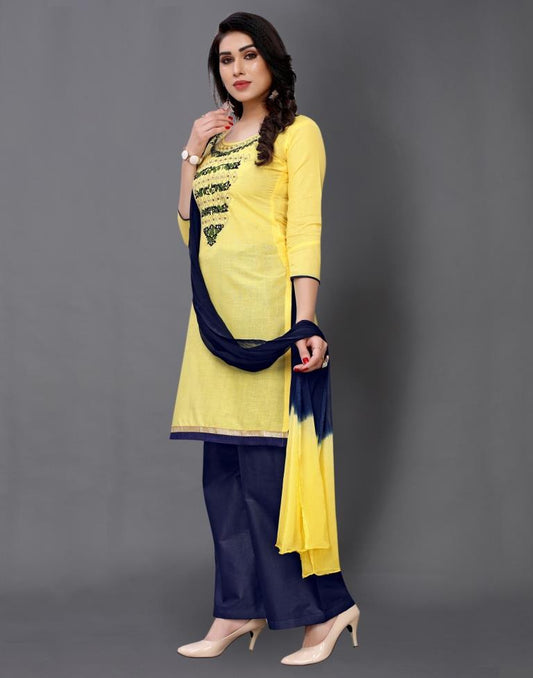 Yellow Cotton Embroidered Unstitched Salwar Suit