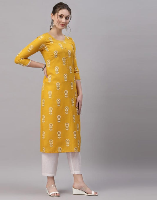 Yellow Printed Rayon Straight Kurta Set With Dupatta