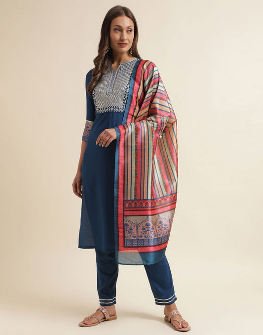 Blue Chinnon Embroidery Straight Kurti With Pant And Dupatta