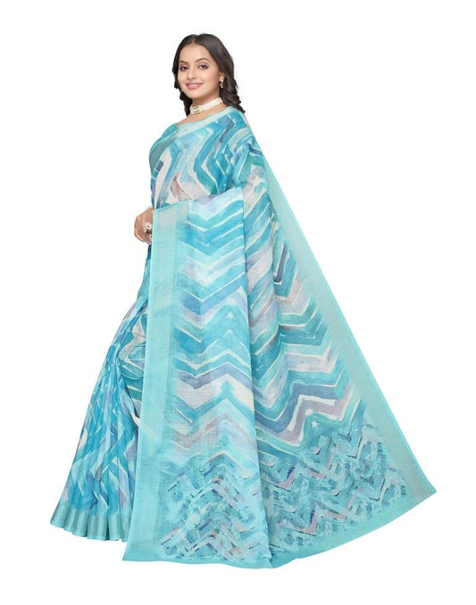 Blue Coloured Linen Digital Printed Jari Border Partywear saree