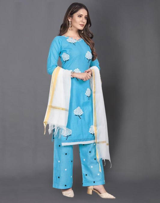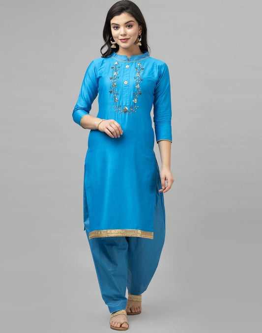 Blue Cotton Embroidered Unstitched Salwar Suit
