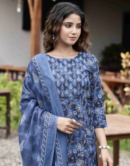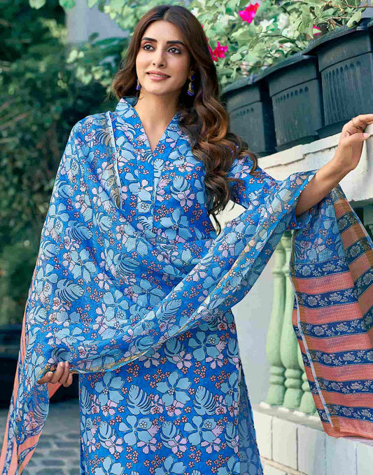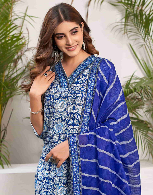 Blue Printed Rayon Straight Kurta With Pant And Dupatta