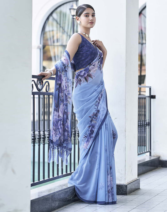 Blue Printed Georgette Saree