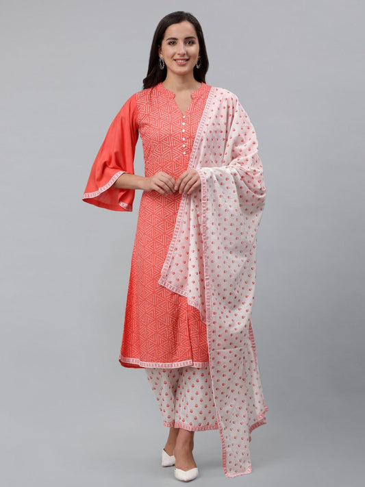 Coral Pink Khadi Printed Kurti with Pant And Dupatta