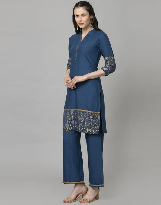 Teal Coloured Cotton Flex Foil Printed Kurti With Palazzo