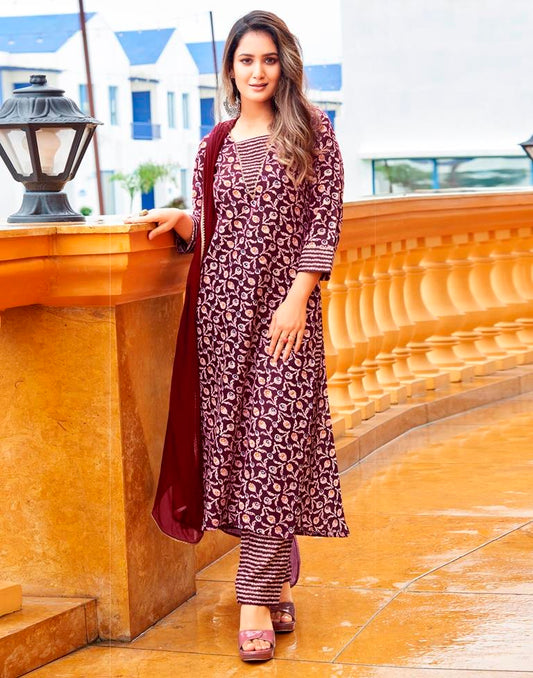 Maroon Printed Cotton Straight Kurta With Pant And Dupatta