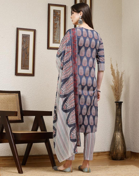 Multicoloured Printed Cotton Straight kurta With Pant And Dupatta