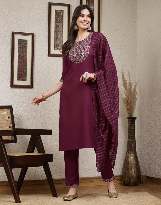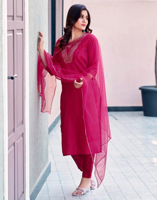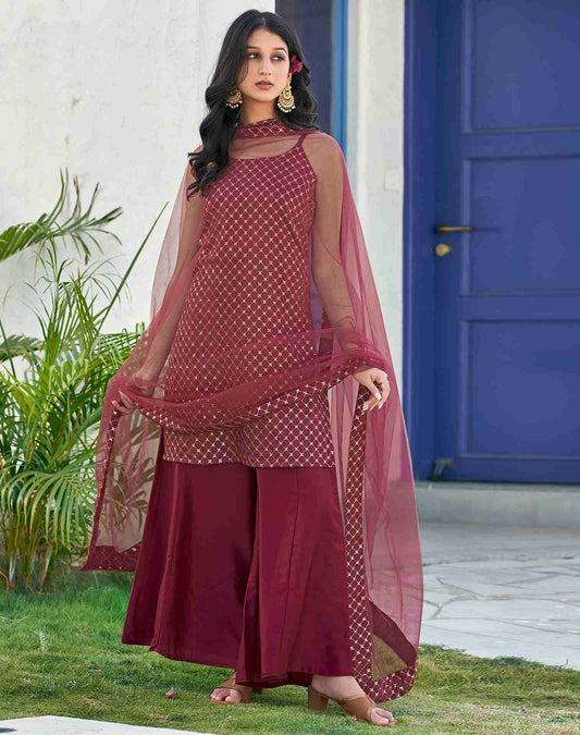 Maroon Embroidery Chinnon Straight Kurta With Pant And Dupatta