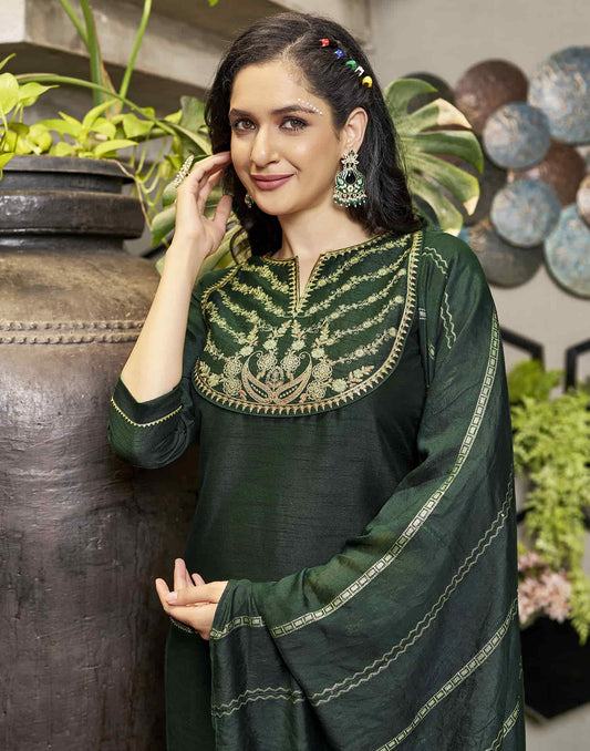 Dark Green Embroidery Silk Straight Kurta With Pant And Dupatta