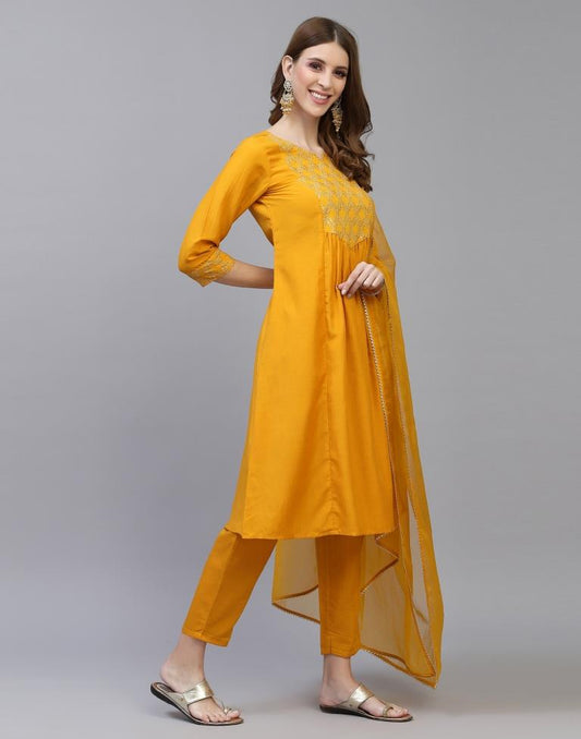 Yellow Silk A-line Kurta With Pant And Dupatta