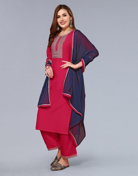 Pink Embroidery Chinnon Straight Kurta With Pant And Dupatta