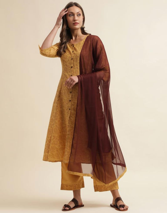 Mustard Printed Chinnon Straight Kurta With Pant And Dupatta