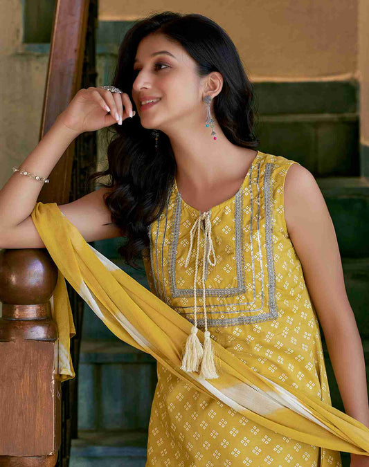 Yellow Printed Rayon Straight Kurta With Pant And Dupatta