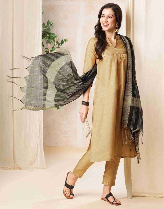 Beige Plain Silk Straight Kurta With Pant And Dupatta