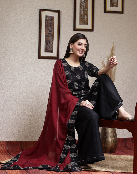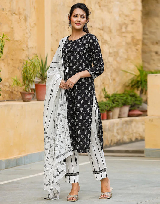 Black Printed Cotton A-Line Kurta With Pant And Dupatta