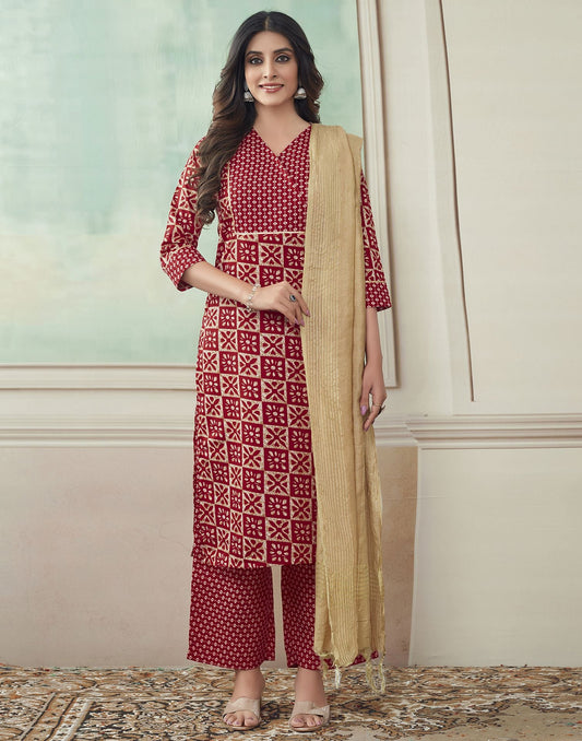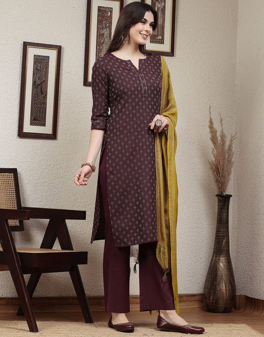 Dark Wine Woven Cotton Straight Kurta With Pant And Dupatta