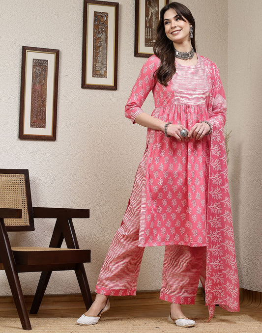 Pink Printed Cotton A-Line Kurta With Pant And Dupatta