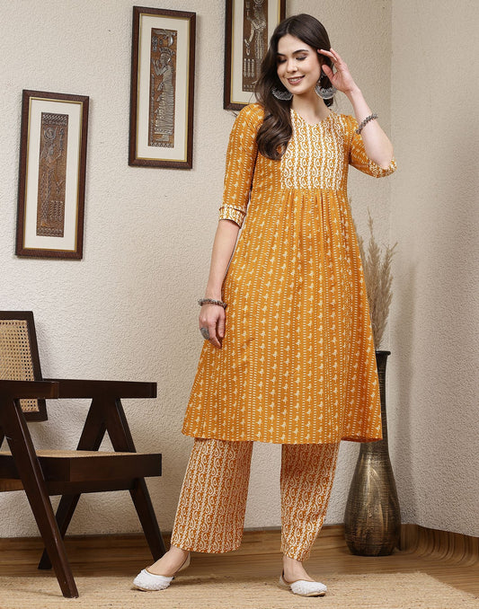 Turmeric Yellow Printed Cotton A-Line Kurta Set With Dupatta