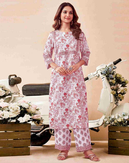 Regular price Rs. 999.00Regular priceUnit price / perRs. 0.00Sale price Rs. 999.00Pink Printed Cotton A-Line Kurta With Pant And Dupatta