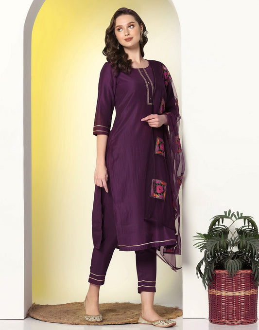 Wine Plain Chinnon Straight Kurta Set With Dupatta