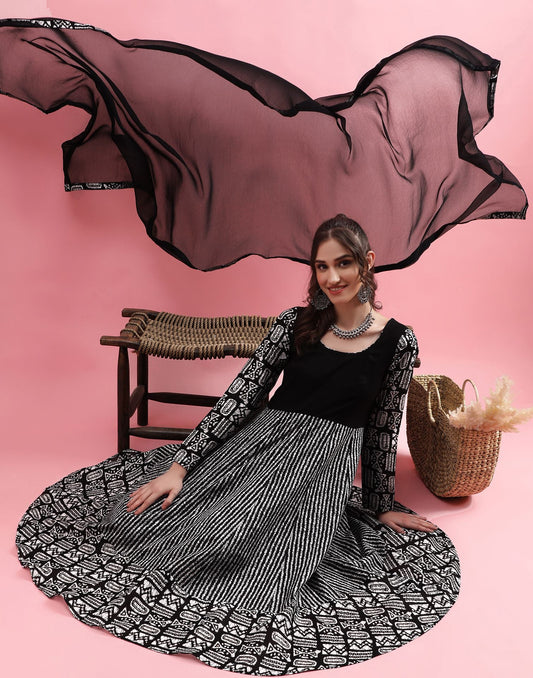 Black Printed Cotton Flared Kurta With Pant And Dupatta