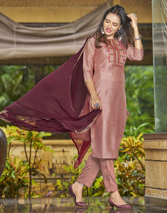 Dusty Pink Embroidery Silk Straight Kurta With Pant And Dupatta