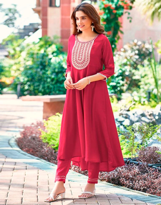 Rose Wood Plain Chinnon Flared Kurta Set With Dupatta