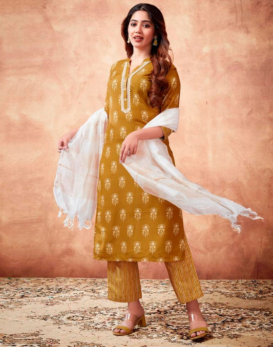 Mustard Yellow Printed Rayon Straight Kurta Set With Dupatta