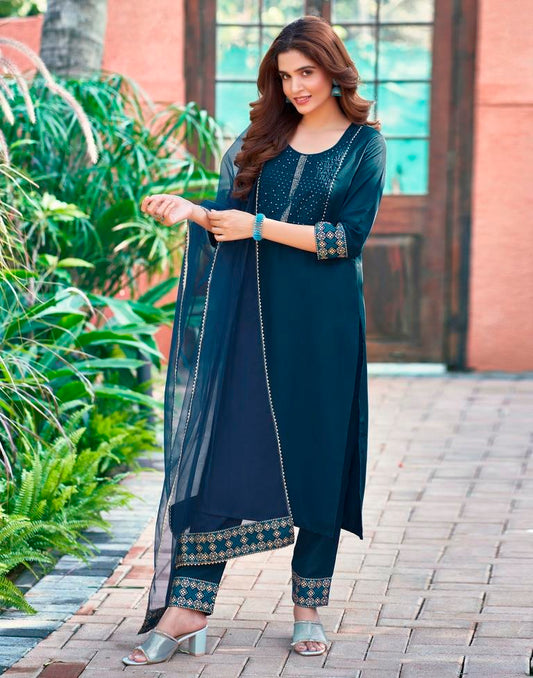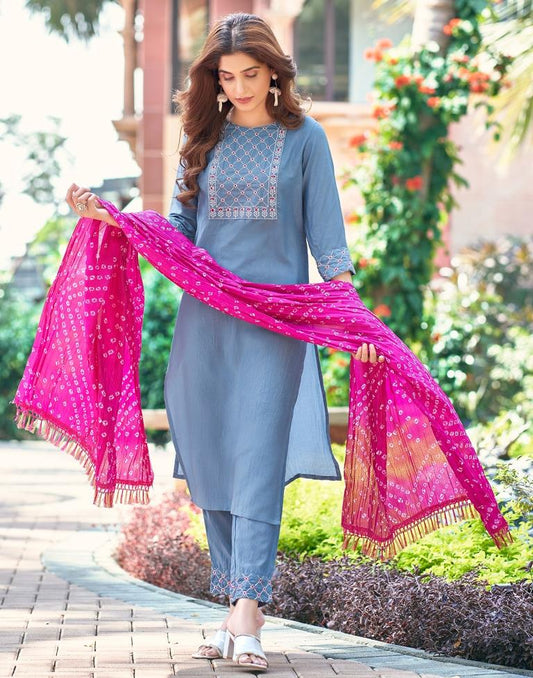 Dusty Blue Plain Chinnon Straight Kurta Set With Dupatta