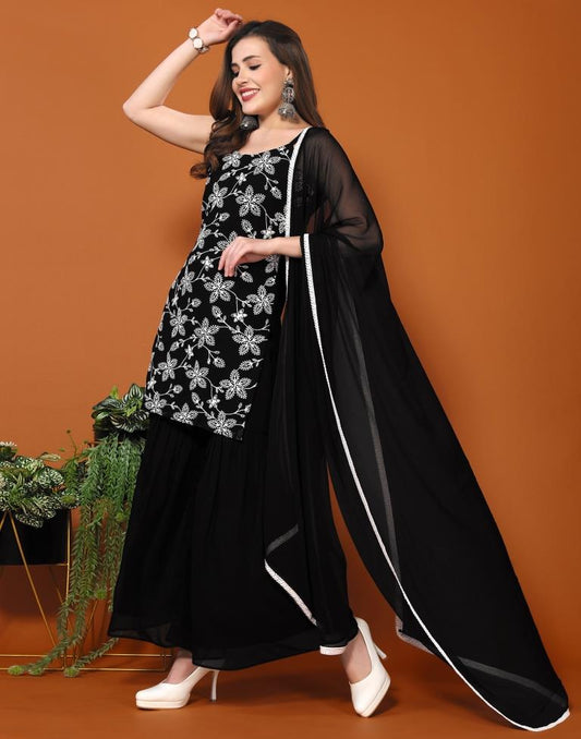 Black Plain Georgette Straight Kurta Set With Dupatta