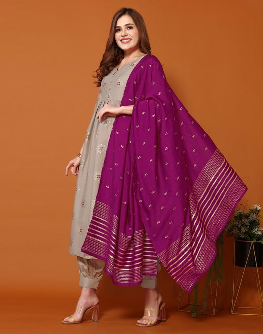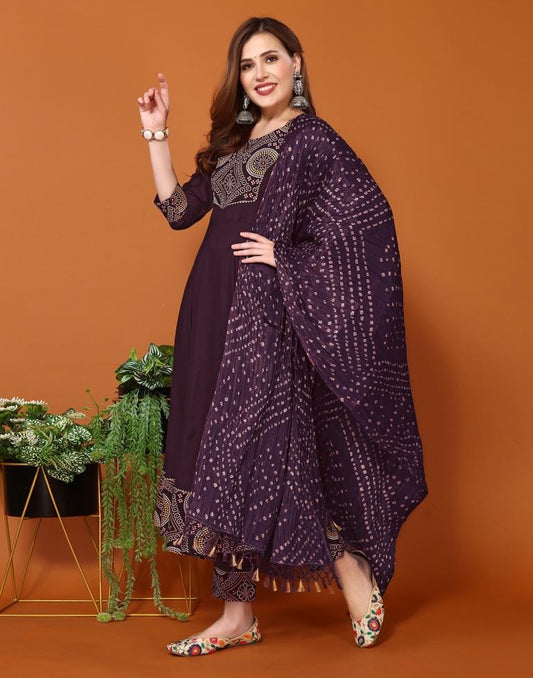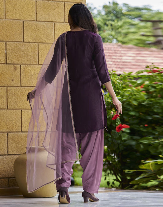 Wine Plain Chinnon Flared Kurta Set With Dupatta