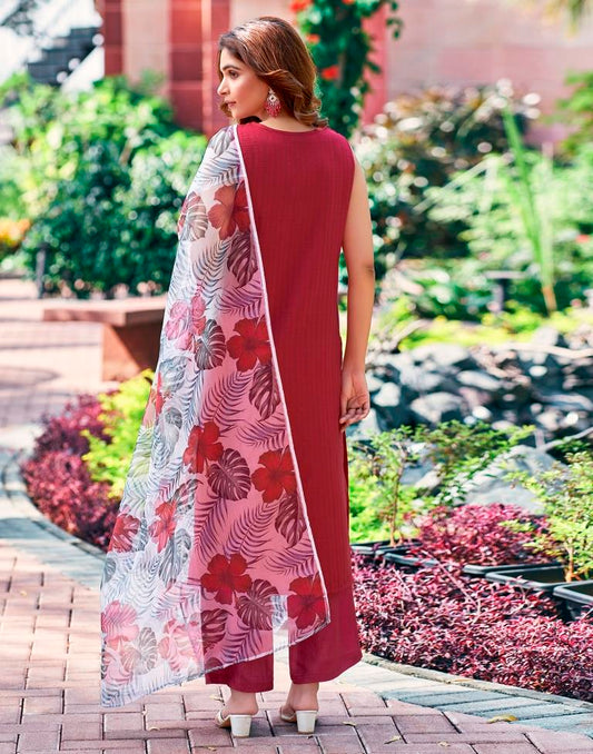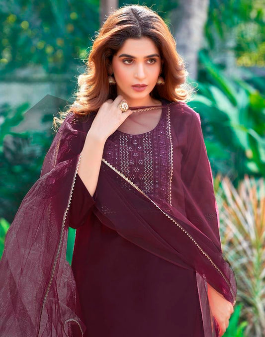 Wine Embroidered Cotton Kurta Set With Dupatta