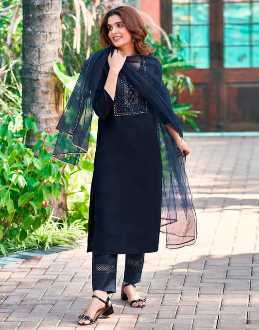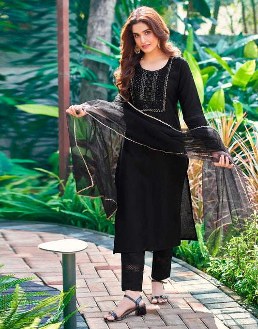 Black Cotton Straight Kurta Set With Dupatta