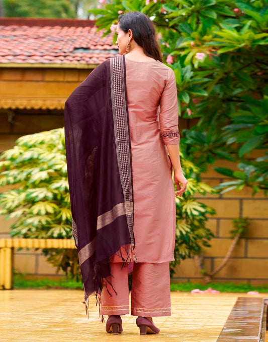 Peach Pink Plain Silk Straight Kurta Set With Dupatta
