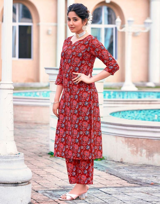 Red Cotton Printed Straight Kurta Set