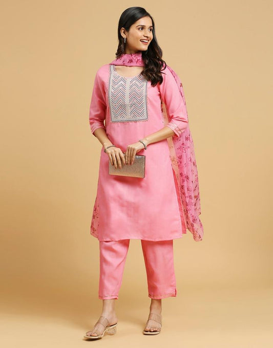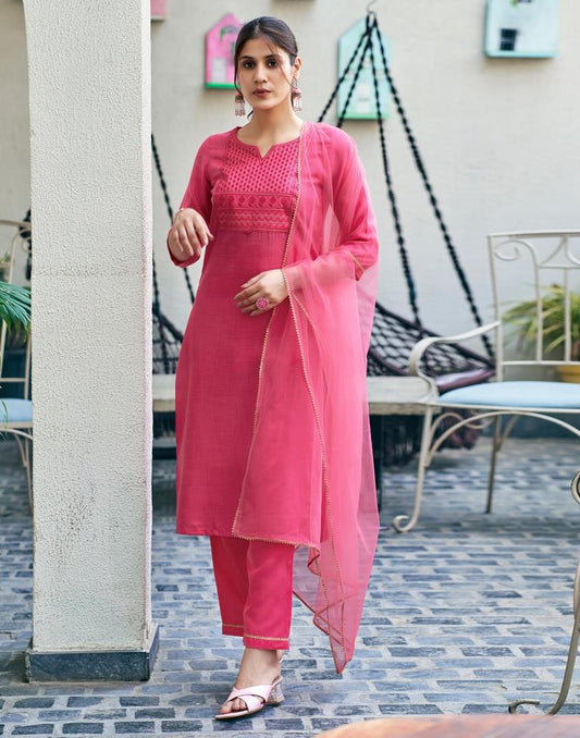 Pink Cotton Embroidery Straight Kurta Set