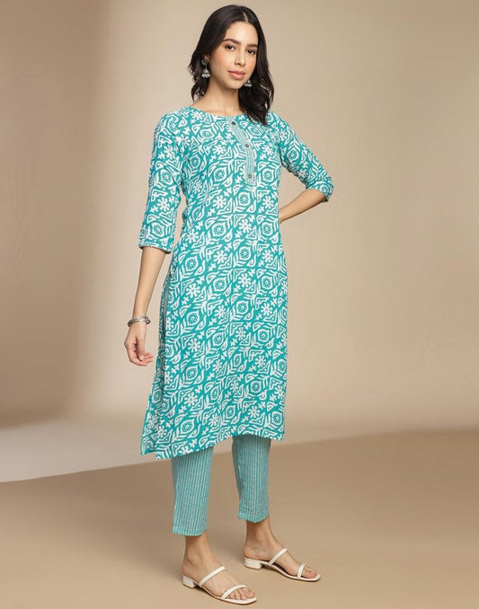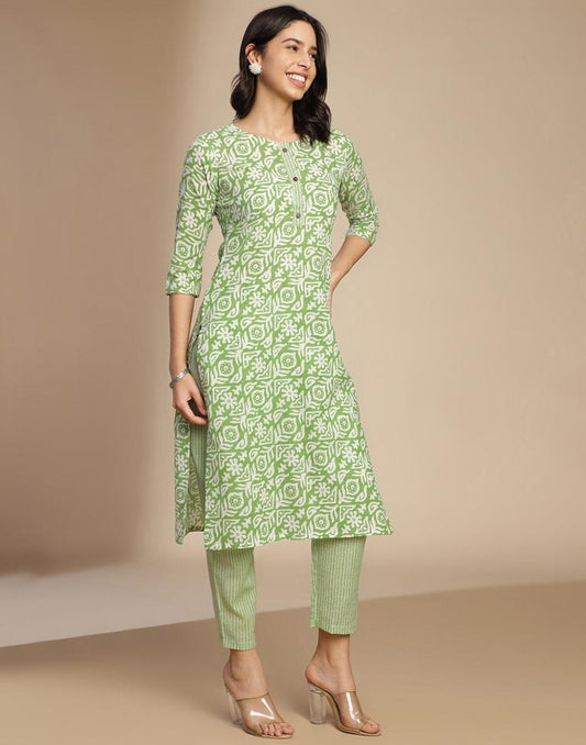 Green Printed Cotton Straight Kurta Set with Dupatta