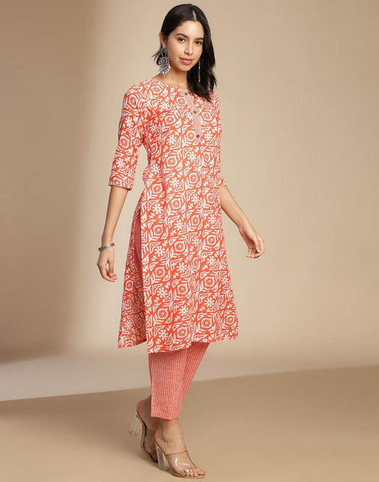 Orange Printed Cotton Straight Kurta Set with Dupatta