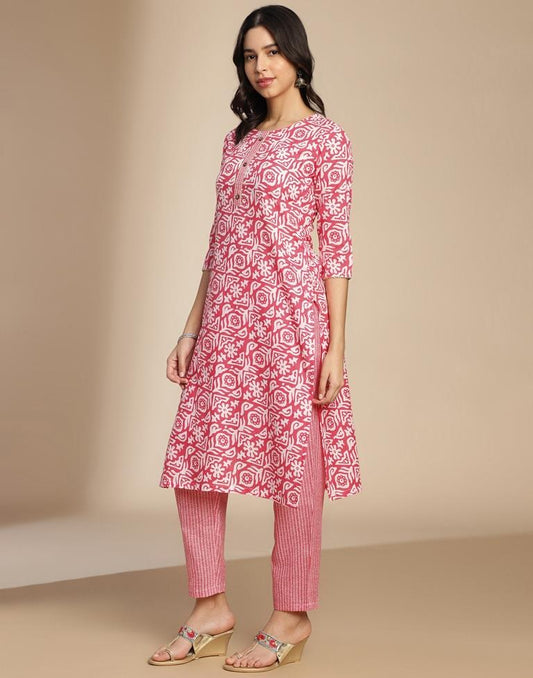 Pink Printed Cotton Straight Kurta Set with Dupatta