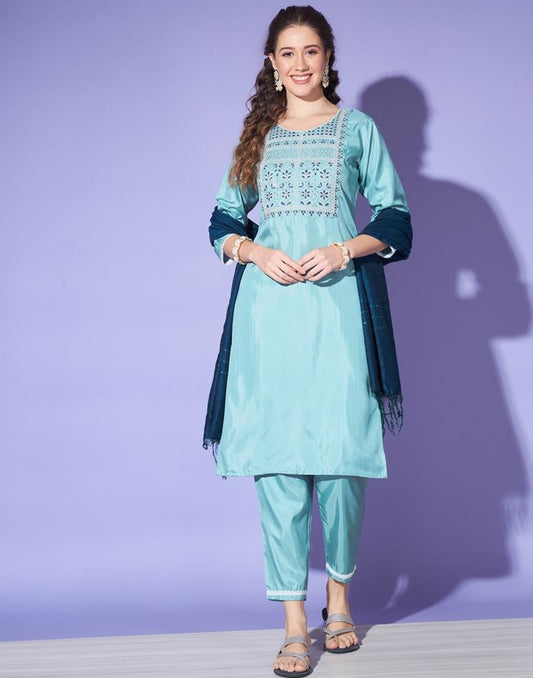 Sea Blue Silk Embroidery Straight Kurta Set