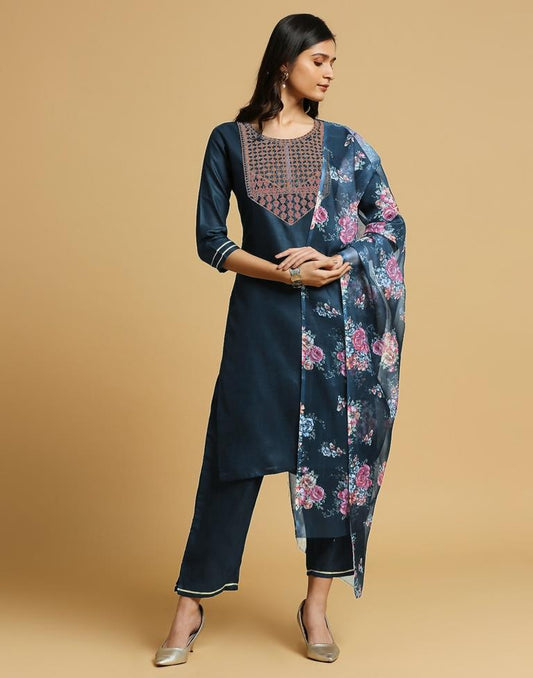 Teal Blue Silk Embroidery Straight Kurta Set
