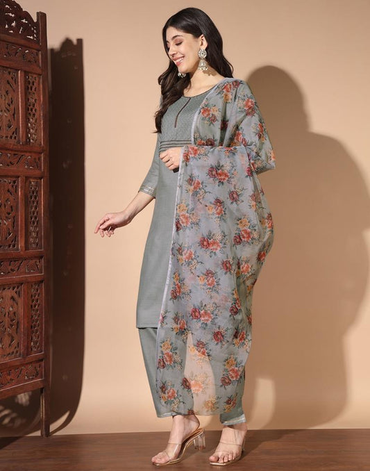 Grey Cotton Embroidery Straight Kurta Set