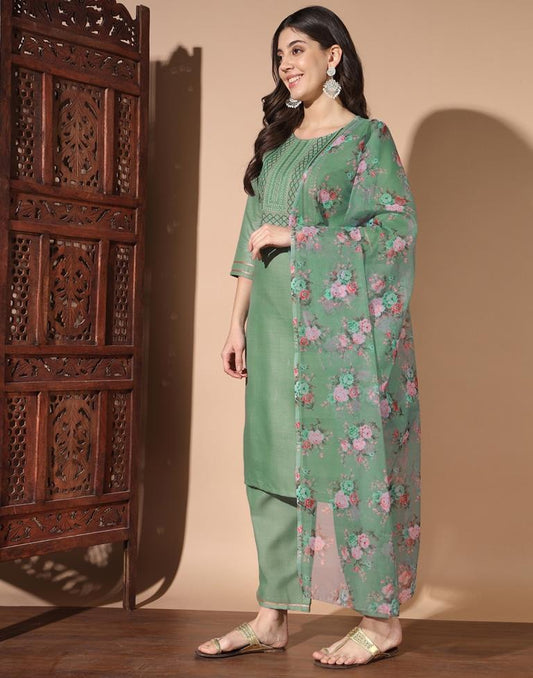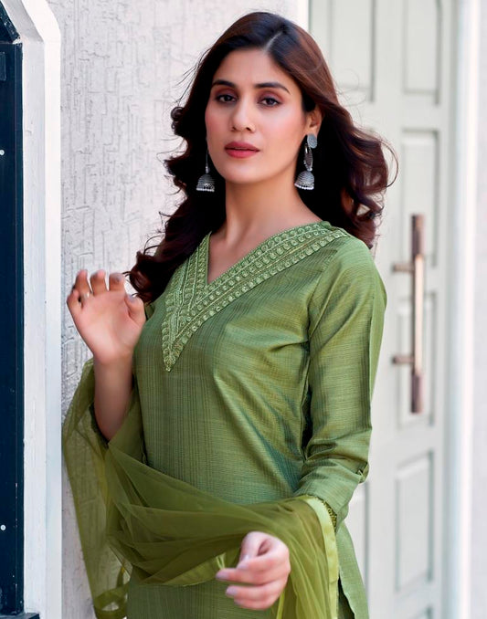 Olive Green Silk Embroidery Straight Kurta Set