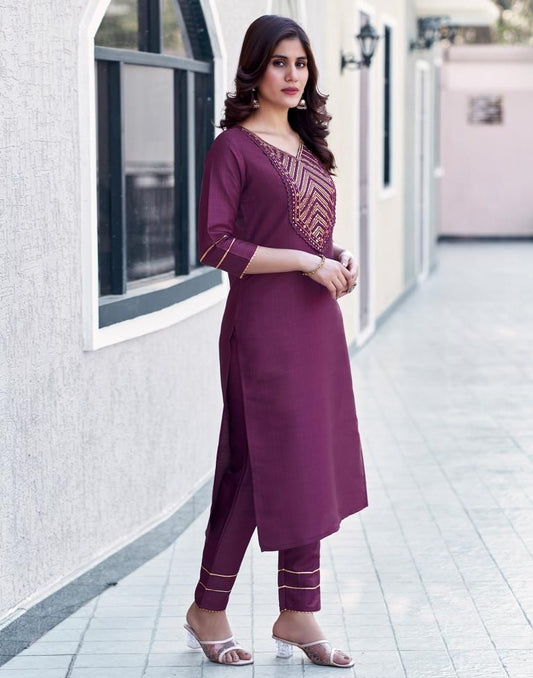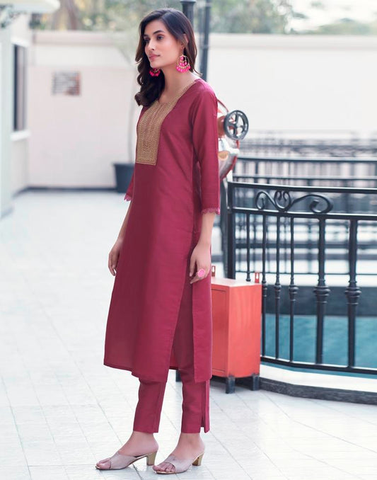 Wine Embroidery Straight Kurta Set