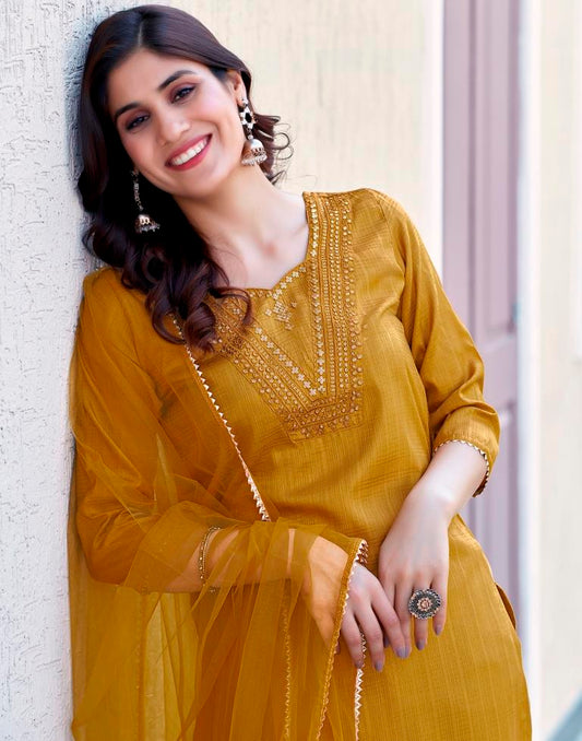 Mustard Yellow Silk Embroidery Straight Kurta Set