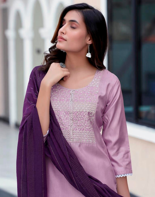 Dark Purple Silk Embroidery Straight Kurta Set