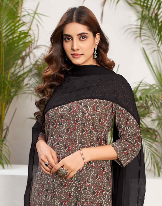Walnut Brown Printed Cotton Straight Kurta With Pant And Dupatta